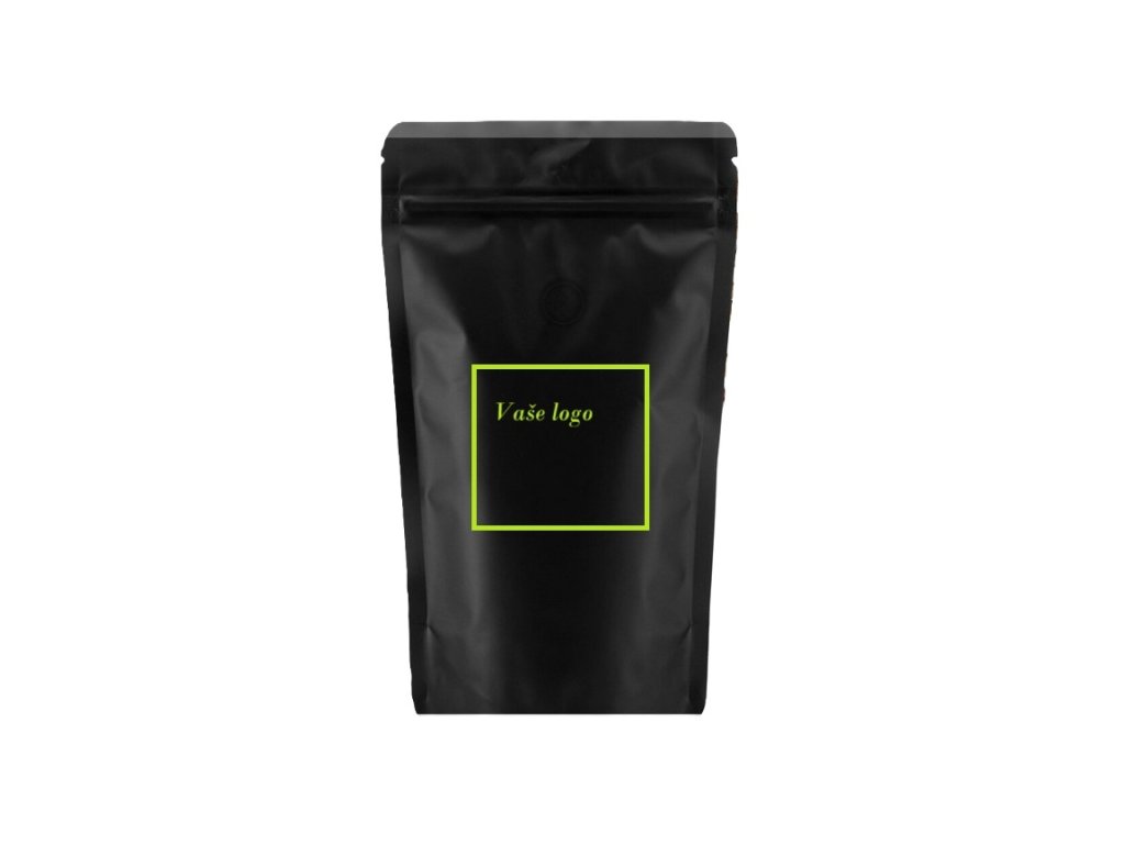 Káva ve 150g sáčku o rozměru 130 x 225 x 70 mm, černý mat, ventil a zip.